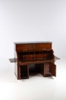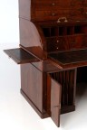 Important cylinder secretary desk in flame mahogany (all sides) with nine drawers, two door panels, and a cylinder revealing two drawers, two secret drawers and ten cubbyholes, two sliding tablets on a plinth; the top in blue Turquin marble (dents in the marble; small dents, esp. on a side baguette)