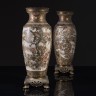 JAPON, Fours de Satsuma - Époque MEIJI (1868 - 1912) Paire de vases de forme rouleau en faïence de Satsuma décorée en émaux polychromes et émail or de réserves ornées de rapaces et pivoines, paons, pins et éventails. H 46 cm (Montés en bronze)