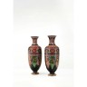 Pair of important flared neck baluster vases in copper and cloisonne enamels decorated on the lower part with eight petals decorated with dragons and phoenixes alternating on brown and green backgrounds surmounted by a frieze of geometric motifs and flowers then a frieze of eight poly-lobed reserves decorated with shishi and two phoenixes facing each other. The shoulder is decorated with friezes of flowers and the neck with eight petals decorated with stylized flowers on a black background. H 137 cm