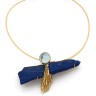 Jean VENDÔME. Années 1970. Important pendentif/broche en forme de papillon stylisé en fils d'or jaune 750‰, les ailes en lapis-lazuli brut, la tête sertie d'un cabochon d'aigue-marine serti clos. Tour de cou rigide en or jaune. Signé et poinçon de MO. Diamètre : 13 cm Dimensions : 6 x 9,5 cm Poids brut : 59,6 g Dans son écrin d'origine.