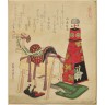 Katsushika Hokusai (1760-1849): Surimono, shikishiban, wooden horse and clock. Signed Fusenkyo Iitsu hitsu. Dim. 20,7 x 18 cm