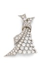 Large "ribbon" lapel clip, Art Déco period, in platinum (850‰) and 18k white gold (750‰) set with old cut round diamonds
