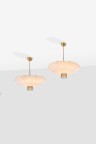 Pair of ceiling lamps Lacquered metal, brass and fabric Edited by Orno Model created circa 1950 H 65 × Ø 60 cm Provenance : Model created for the Heinola Sanatorium, Finland