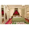 Bed headboard, two night tables, two lamps, curtains and bedcover