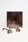 Fireplace set including a fireback and a pair of andirons Cast iron and brass Fireback: H 55.5 × W 54.5 × D 2.5 cm Andiron: H 19.5 × W 13.5 × D 37 cm