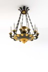 Chandelier in gilded and patinated bronze, with twelve arms and foliage and palmette; (electrified)