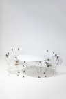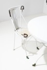 Set of a table and four garden chairs Patinated bronze, lacquered and perforated sheet steel Model created circa 1960 Table: H 73 × Ø 120 cm Chairs: H 87 × W 45 × D 40 cm
