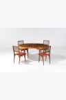 Dining table with extensions and set of four chairs Peroba, caning and leatherette Model created in the 1950s H 75ר 117cm (table) H 75×L 160×W 117cm (with extensions) H 86×L 43×W 50cm (chairs)