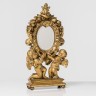 Miroir en bois doré à décor de deux amours, feuillages et flurs ; (transformation d’un reliquaire) travail italien du xVIIIe siècle (miroir rapporté) H 61 x L 31 cm Provenance : Succ. de Mr J H . Vente au profi de ICM . Institut du cerveau et de la moelle épinière
