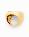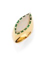 Modernist marquise-shaped ring in 18k yellow gold (750‰) set with a frosted rock crystal surrounded by round diamonds and green stones. Tdd: 50 Dimensions: 2.5 x 3 cm Gross weight: 23.3 g