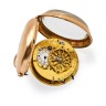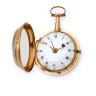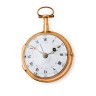 Cadran en émail blanc (accidents), chiffres romains pour les heures, arabes pour les minutes, quantième en rouge, aiguilles 'Breguet' (postérieur) en laiton ; mouvement en laiton doré, pont, ajouré et gravé, disque de régulateur en argent, échappement à verge, piliers cylindriques, sonnerie sur timbre, échelle pour la vitesse de la sonnerie gravée sur la platine ; boîtier en or uni. D. 48 mm. A nettoyer