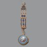 Montre de gousset en ors de deux tons 18K (750‰) finement ciselé et émaillé polychrome ornée d'une scène de bergerie. Cadran émaillé blanc avec chiffres arabes peints, aiguilles en or jaune. Mouvement à coq. Châtelaine en or jaune 18K (750‰) émaillé double face. Fin du XVIIIe - Début du XIXe siècle. Poids brut : 31,8 g