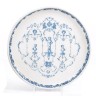 Plateau circulaire à décor en camaïeu bleu dans le style de Berain au centre d’amour et buste de fleurs dans des encadrements de rinceaux feuillagés.