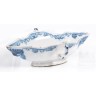 Saucière ovale à deux anses, les déversoirs ornés de masque de satyre à coiffe indienne, à décor en camaïeu bleu de bouquets de fleurs et rinceaux.