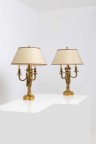 Pair of candelabras in gilded bronze with three lamps and garland décor