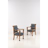 Pair of inverted-back armchairs, in natural wood - Italy The front base formed by caryatids, the rear base sabre-shaped.