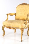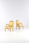 Pair of flat backrest armchairs in painted wood, with foliage and flower decor, on arched feet (repainted)