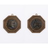 Pair of patinated terracotta medallions representing Molière and Racine, in octagonal patinated and gilded wood frames decorated with f