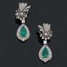 Paire de pendants d'oreilles en platine (850‰) à décor de gerbes sertis de diamants ronds et taille carré. Ils retiennent chacun en pampille un motif goutte amovible serti de diamants ronds et baguette entourant une émeraude taillée en poire calibrant environ 2,50 carats (légères égrisures et manque de matière à la culasse). Les raquettes en or gris 18K (750‰). Poids brut : 20,1 g.