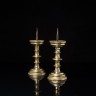 Paire de pique-cierges en bronze, légères différences, fût tourné à trois noeuds aplatis avec le médian plus large, coupelle moulurée, pique en fer, base moulurée à gradins. Flandres, XVe siècle H 31,5 cm et 32,3 cm (Petite déformation à une base, plaques en fer percées par l'oxydation)