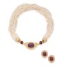 Jewelry set in 18k yellow gold, cabochon ruby and round-cut diamonds including a 12 rank cultured pearls necklace and a pair of ear cli