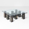 Paul Evans (1931-1987) Table basse Acier patiné, bronze et verre Édition Directional Date de création : vers 1970 H 38 × L 106 × P 106 cm