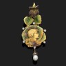 Pendentif articulé en or jaune émaillé polychrome rehaussé de petits diamants taillés en rose. Il est orné d'un profil de femme dans des feuillages et agrémenté d'une perle en pampille.