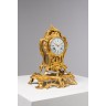 Pendule en bronze doré à décor rocaille de coquilles et trophée de musique, reposant sur une base simulant des rochers. Le cadran émaillé blanc à chiffres romain et arabes. . Style Louis XV, XIXe siècle Haut. 36 cm