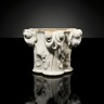 Petit chapiteau d’applique en marbre blanc sculpté avec trois crosses feuillagées et deux feuilles d’acanthe, base trilobée. Deuxième tiers du XIIIe siècle H 12,5 × L 16,8 × P 9 cm (petit manque à la base)