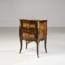 Petite commode en bois de rose et amarante, la façade galbée ouvrant à deux tiroirs, reposant sur des pieds cambrés ; dessus de marbre brèche d’Alep (réparé) ; ornementation de bronzes dorés (certains rapportés). estampille de jean ulric erstet, ébéniste reçu maître en 1763 epoque Louis xV (restaurations) H 85 x L 64 x P 42 cm Provenance : Succ. de Mr J H . Vente au profi de ICM . Institut du cerveau et de la moelle épinière