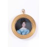 Pierre Edouard Dagoty (1775-1871) Portrait of Young Girl in Blue Crinoline Dress Round miniature signed and dated 1829, gilt bronze frame H 7, 5 cm (on view).