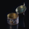 Pyxide en cuivre champlevé, émaillé, gravé et doré ; émail bleu lapis, bleu turquoise, vert, jaune, rouge, blanc. Corps cylindrique à décor de bustes d’anges dans des médaillons séparés par des flurons ; toit conique orné de fleurons dans des rinceaux ; intérieur doré. Limoges, second tiers du XIIIe siècle H 12 cm (usures à la dorure, très légers manques aux émaux, croix peut-être remplacée anciennement