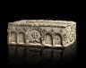 Rare cuve baptismale en pierre calcaire sculptée en fort relief sur trois côtés. Façade ornée de cinq arcatures en plein cintre avec arc central plus important souligné d'un ruban plissé, les autres de billettes, écoinçons meublés de rosaces fluronnées ; cet arc médian est appuyé sur des colonnettes aux chapiteaux sculptés de griffns affontés, un antérieur levé ; le tympan porte une croix aux branches légèrement épatées entourée d'un cercle d'olives surmontant deux oiseaux qui s'abreuvent symbolisant l'Eucharistie ; face latérale gauche à décor d'une branche enroulée aux ramifiations disposées en éventail se terminant en crosse feuillagée avec grappes de raisin, le tout inscrit sur un arc à chevrons ; de part et d'autre, en plus faible relief, rameau dressé à tiges entrelacées ; face latérale droite avec arc en plein cintre à décor de damier reposant sur des colonnettes aux chapiteaux à crossettes abritant un ruban rainuré entrelacé formant un quatre-feuilles dans un ovale ; deux rameaux à volutes s'achevant en palmette encadrent cet arc ; une extrémité du rameau de gauche est retenue par la gueule ouverte d'une tête léonine placée à l'angle droit de la cuve ; une fiure masculine en buste coiffe d'un bonnet orne l'angle opposé. Le bord du côté droit présente une pente inclinée vers l'intérieur ; trous d'évacuation d'eau. Angoumois, fi du XIe/ début du XIIe siècle H 53 × L 148 × P 92 cm Cette cuve proviendrait du village de Chateauneuf-sur-Charente situé à une quinzaine de kilomètres d'Angoulême qui possède une des plus imposantes églises romanes de la région. C'est après 1081 que l'abbaye voisine de Bassac y avait en efft fondé un prieuré dédié à saint Pierre, prieuré remplacé au cours de la première moitié du XIIe siècle par un nouvel édifie de plus vastes dimensions. Le décor sculpté de la cuve est d'un style encore archaïque que l'on peut dater d'avant la grande efflescence ornementale romane des années 1130. On voit en efft un répertoire assez restreint faisant la part belle au thème architectural avec sa façade qui rappelle celle d'une église ainsi qu'aux compositions végétales avec ses rinceaux épais et ses feuilles dérivées de l'acanthe. Le thème animalier est limité à une tête de félin et à deux colombes, quant à l'humain, il n'est présent que par un petit buste de personnage. Il semble que la réalisation de cette cuve est à situer un peu avant celle de la cathédrale d'Angoulême entreprise vers 1108 ; sur la façade de laquelle, on retrouve en efft le ruban plissé, les frises de damier et les rinceaux vigoureux aux tiges nervurées mais dans un style plus abouti (fi.). La forme de ces fonts baptismaux, rectangulaire et d'assez grande taille, permet également de placer cette cuve dans l'évolution des rites du baptême. Pratiqué au cours des premiers siècles dans les rivières ou les fluves, le baptême s'effctua ensuite dans des baptistères. Ce n'est qu'à partir de la fi du VIIIe siècle que l'on commença à administrer le baptême à l'intérieur des églises paroissiales dans des grandes cuves à même le sol. Le rite s'effctuait alors par immersion, totale ou partielle, en plongeant le catéchumène dans l'eau. Ce ne fut qu'à partir du XIIIe siècle, que l'on commença à pratiquer le baptême par infusion c'est-à-dire en versant de l'eau sur la tête du catéchumène dans des cuves surélevées de forme généralement circulaire. La cuve romane présentée ici est un des rares témoignages, à l'instar de la célèbre cuve de la cathédrale d'Amiens, du passage du baptême par immersion au baptême par infusion. Le bord pentu vers l'intérieur - que l'on observe sur le côté droit de la cuve - devait faciliter ce rite de la semi-immersion du catéchumène. Ouvrages consultés : M-T. Camus, E. Carpentier, Sculpture romane du Poitou, Paris, 2009 ; Exposition Poitiers 2011, L'Âge roman – Arts et culture en Poitou et dans les pays charentais. Xe-XIIe siècles, musées du Poitou-Charentes, cat. ; J. Houdant, Fonts baptismaux en pays de Somme du 10e au 13e siècle, s.d.; Cuves baptismales et fonts baptismaux : évolution formelle avant le XVIe siècle, site internet du Ministère de la culture.