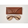 RAY BAN PAIRE de LUNETTES "AVIATEUR" en métal doré et cuir, verres fumés Signature sous cuir Dans son étui d'origine Env. 14 cm Iconographie : droits réservés