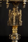 Reliquaire-monstrance en cuivre moulé, ciselé, gravé et doré. Partie reliquaire à six pans à gables fleuronnés, cantonnés de contreforts avec nombreux pinacles portant, à gauche, l'archange Gabriel, à droite, la Vierge, qui figurent l'Annonciation, soubassement à godrons ; noeud à claire-voie avec fenêtres repercées de remplages, contreforts et pinacles ; large base allongée aux bords ajourés, découpée de six lobes rentrants outrepassés avec décor de fleurons surmonté d'un noeud de volutes en 8. Italie du sud, vers 1500 H 36 × L 21,2 cm (Deux bagues modernes, toit manquant, remontage ?)