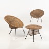 Roberto Mango (xxe) Paire de fauteuils ronds et table basse porte-revues Osier et acier Date de création: vers 1950 Fauteuils: H 70 × Ø 77 cm Table: H 44 × Ø 57 cm