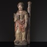 Sainte Barbe en chêne sculpté et polychromé, dos creusé. Debout, elle tient un livre ouvert