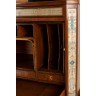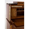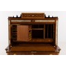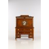 A mahogany secretary, forming a chest of drawers, opening with four drawers and a flap revealing seven drawers, four of which are in a pivoting case revealing five other secret drawers, several compartments and a sliding shelf, with a secret drawer concealed by a sliding panel, decorated with printed fabric panels, the central panel octagonal in shape after an engraving by Antoine Boizot (1702-1782) entitled the genius of painting, the lower part with detached columns; (small accidents).