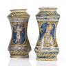 Deux albarelli cintrés à décor polychrome d’un évêque et d’un ange tenant une croix dans des médaillons sur fond de trophées.