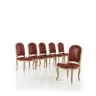 Six Chaises en bois mouluré et laqué blanc, reposant sur quatre pieds courbés.