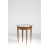 Mahogany and veneer bouillote table with two drawers and two shelves, resting on four fluted tapered legs. White marble top with gilt