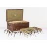 Tapio Wirkkala (1915-1985) modèle Duo Ménagère Métal argenté Edition Christofle, cachets et poinçons d'orfèvre Date de création :1957 composée de couverts: 13 fourchettes de table, 12 couteaux de table, 13 cuillères à soupe, 12 fourchettes à poisson, 12 couteaux à poisson, 12 fourchettes à entremets, 13 cuillères à entremets,12 fourchettes à dessert, 5 cuillères à dessert, 12 cuillères à café, 2 pinces à sucre, 1 grande et 1 petite louche, 1 couvert à salade, 1 pelle à tarte, une suite de 4 couverts de service , on y joint une fourchette de service, deux pelles. Bibliographie: Anne Bonny "Les Années 50", modèle similaire reproduit p. 358
