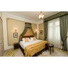 Bed headboard, bedcover, curtains, two night tables and round side table