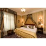 Headboard, 110 x 190 cm, two night tables 74 x 47 x 37 cm, two lamps, H 50 cm, bedcover, curtains, small rectangular table 65 x 60 x 45 cm