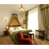 Headboard, 110x200 cm, two night tables, 60x35x35 cm, two lamps, H 60 cm, bedcover and curtains