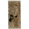 Torii Kiyonobu (1664-1729) Hoso-e, urushi-e, Sanjo Kantaro en courtisane tenant une feuille de papier sur laquelle écrit Bando Hikosaburo assis dans un rôle de samouraï. Signé Torii Kiyonobu hitsu, éditeur Sagamiya. 33,6 × 14,8 cm (Écorchure sur le bord droit) Encadrée sous verre. Exposition : Estampe exposée à la première exposition Koechlin de 1909 au Musée des arts décoratifs de Paris et décrite dans Ch. Vignier et H. Inada, Estampes japonaises primitives: Tirées des collections de: MM. Bing, Blondeau, Bullier, comte de Camondo, Chialiva, m. & mme. Curtis, J. Doucet, mme.Gillot, Haviland, Hubert, Isaac, Jacquin, R. Koechlin, mme. Langweil, Manzi, Marteau, Migeon, G. Moreau, Mutiaux, du Pré de Saint Maur, H. Rivière, A. Rouart, Léonce Rosenberg, Ch. Salomon, comte de Tressan, H. Vever, Vignier et exposées au Musée des arts décoratifs en février 1909 Paris: Ateliers photomécaniques D.A. Longuet. Provenance : Ancienne collection Charles Salomon, vente à l'Hôtel Drouot, du 9 au 11 juin 1926, n°2 et illustrée planche I.