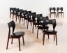 Tove (1906-1994) & Edvard Kindt-Larsen (1901-1982) Série 1550 Ensemble de douze chaises Palissandre, teck et cuir Edition Thorald Madsen Numérotées de 9 à 20 Etiquette d'origine Thorald Madsen Snedkeri Kobenhavn Date de création : vers 1960 H 82 × L 48 × P 49 cm Bibliographie : - 40 years of Danish furniture design : the Copenhagen Cabinetmakers’ Guild exhibitions 1927-1966, Grete Jalk, Lindhardt et Ringhof, 2017, p. 203 - Design Museum Danmark, Furniture index, modèle référencé sous le n° RP 00873