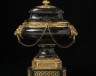 Vase d’ornement de forme navette en jaspe vert, la monture de bronze doré à mufls de lion à anneaux réunis par des chaînettes, la base à frise de perles, entrelacs et brettés ; reposant sur un socle en marbre noir à cercles entrelacés sur fond de brettés ; le couvercle orné d’un fruit feuillagé (restauré). Epoque Louis xVI (Accidents et restaurations) H 33 x L 26 cm