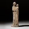 Vierge à l’Enfant en pierre calcaire de Savonnières-devant-Bar (Meuse) sculptée en ronde-bosse. De canon élancé, elle porte l'Enfant assis sur son bras gauche ; elle est revêtue d'un voile mi-long qui encadre son visage, d'une robe et d'un manteau ouvert dont un des pans est retenu par l'avant-bras droit ; plis aux bords ondulés en cascade ; l'Enfant tient un livre de ses deux mains, montrant de l'index le texte à sa Mère. Nord-est de la France, Argonne, première moitié du XIVe siècle H 88 cm (Petit manque sur le bord du voile et du manteau, légère érosion)