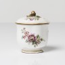 Vincennes Pot à sucre couvert en porcelaine tendre nommé pot à sucre lizonné à décor polychrome de bouquets de flurs, groupes de fruits et tiges fluries, la prise du couvercle en forme de gland et feuillage, fiet or sur les bords. Marqué : LL entrelacés et trois points en bleu xVIIIe siècle, vers 1752 H 11 cm Fêlures et éclats